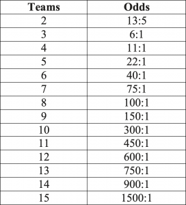 Bookmakers came up with an innovative way to remedy this situation by introducing an alternative form of parlay betting, sometimes referred to as a “parlay card.” All of the selections that are made are treated as a group. Instead of rebetting after each result is known, only a single wager is required. A table of special odds is offered, with payouts dependent upon the number of selections made.